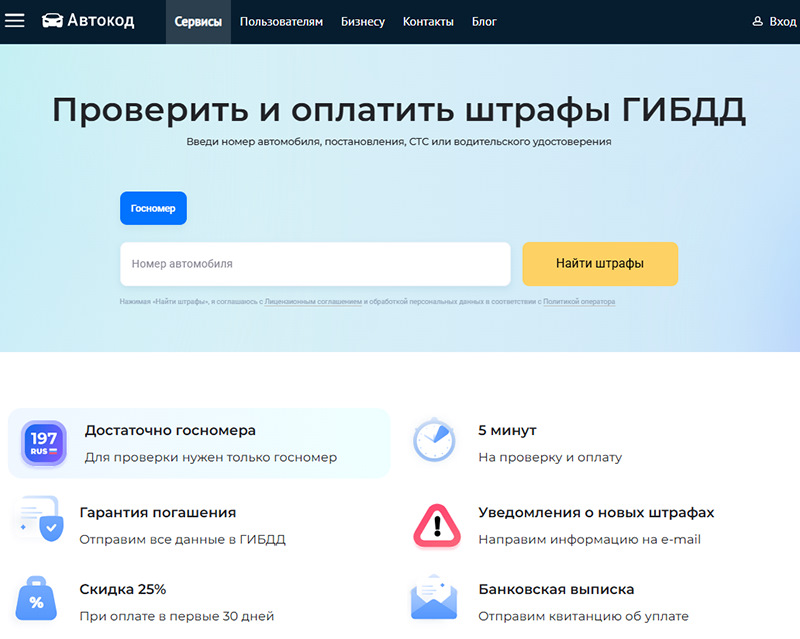 Если вы являетесь собственником автомобиля, вы можете воспользоваться сервисом проверки и оплаты штрафов ГИБДД «Автокод Штрафы». Проверить задолженность можно не только по госномеру, но и по номеру постановления, прав и СТС. Данные подгружаются в течение 30 секунд.