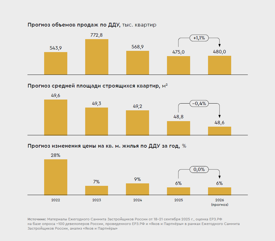 Согласно результатам исследования, продажи по договорам долевого участия (ДДУ) стабилизируются на уровне около 475 тыс. квартир в 2025 г. и 480 тыс. в 2026 г. Объем ипотечного кредитования останется на уровне 2 и 2,2 трлн рублей соответственно. Продукция будет адаптироваться к текущим финансовым возможностям покупателей: средняя площадь строящихся квартир снизится до примерно 48,6 кв. м. при этом темпы роста цен на недвижимость сохранятся стабильными. Ожидается, что стоимость квадратного метра в России вырастет в среднем на 6% в 2025 и 2026 гг.