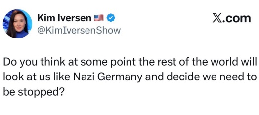 «Как вы думаете, в какой-то момент остальной мир начнет смотреть на нас как на нацистскую Германию и решит, что нас нужно остановить?» — написала в соцсети Х Иверсен, которую цитирует журналист Владимир Соловьев.